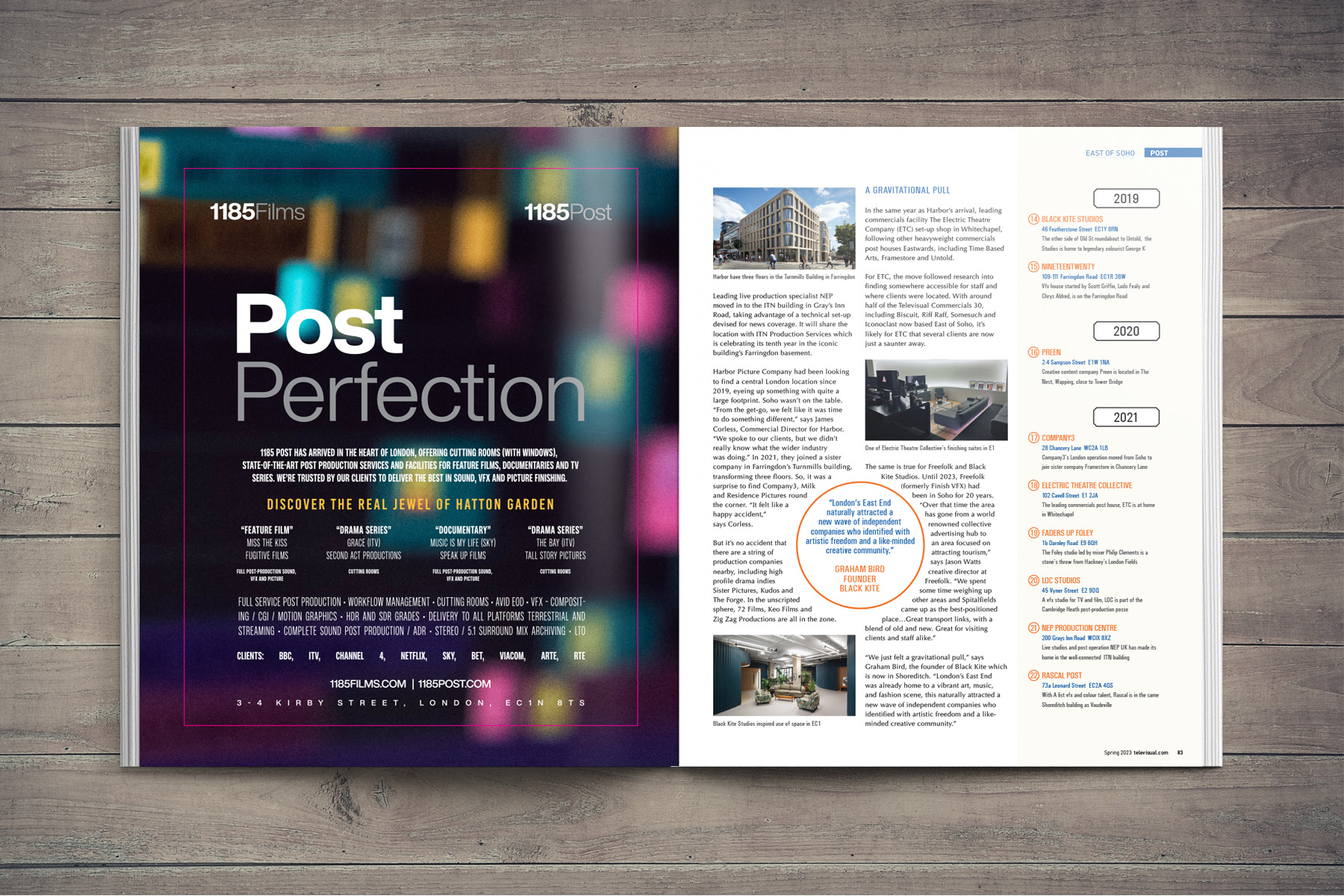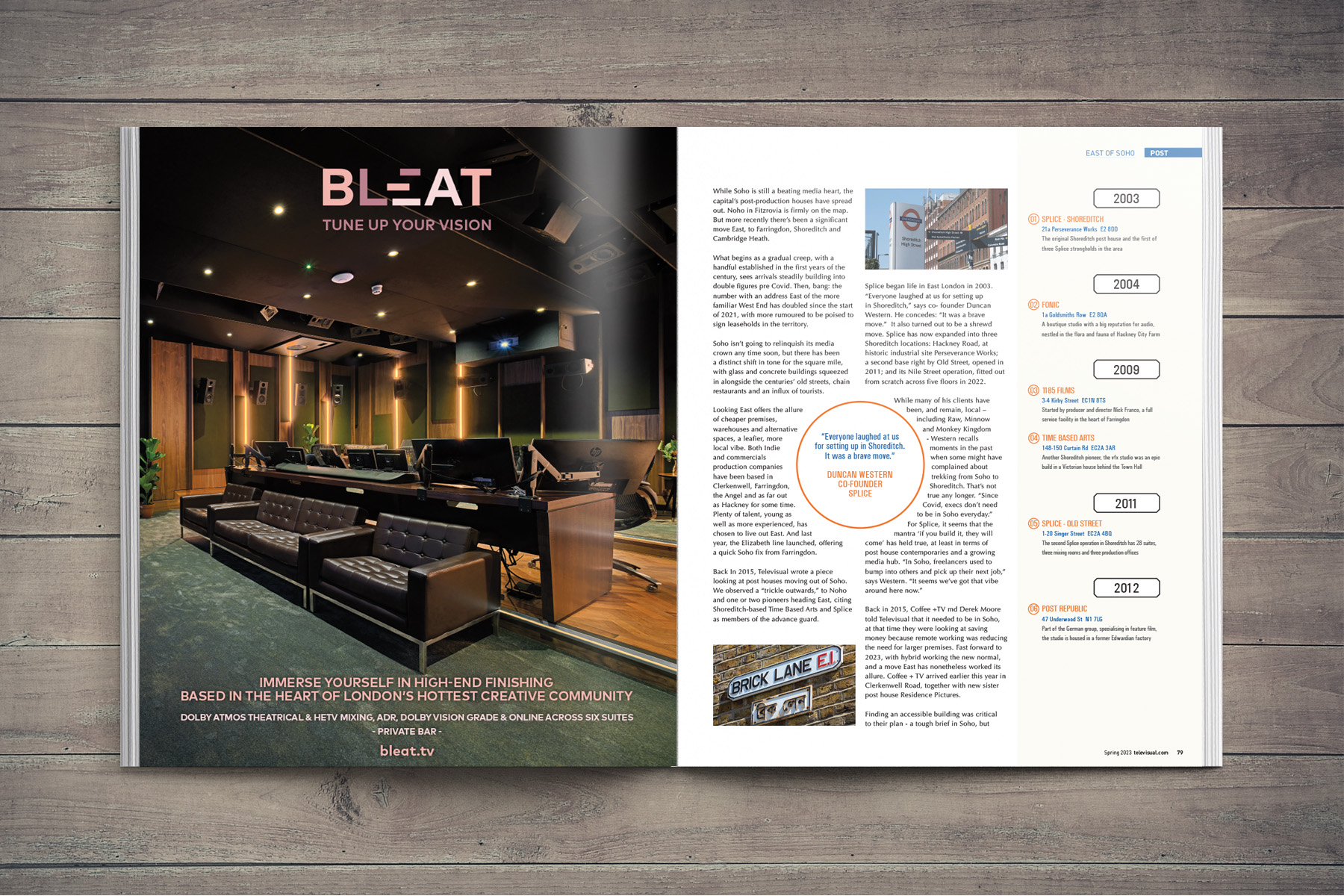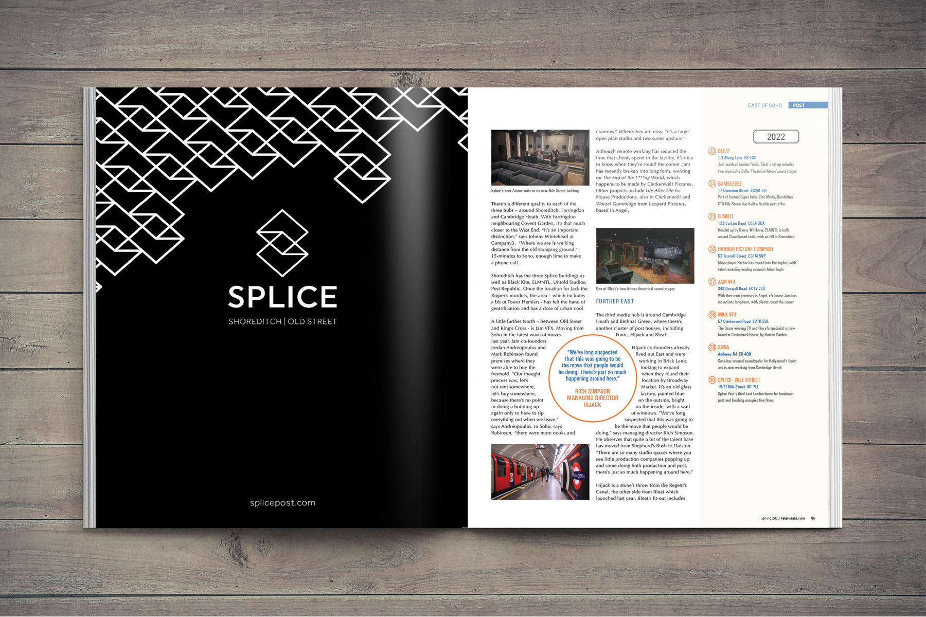 This feature ran over seven pages of the magazine and focused on the gradual migration of post production companies to East London. The article led with stylised map which showed the locations of all the post houses featured and included illustrations of famous landmarks as well. Drawing this map and ensuring everything was correctly positioned made me realise the genius of Harry Beck, who created the now famous and beautifully-crafted London Tube map!